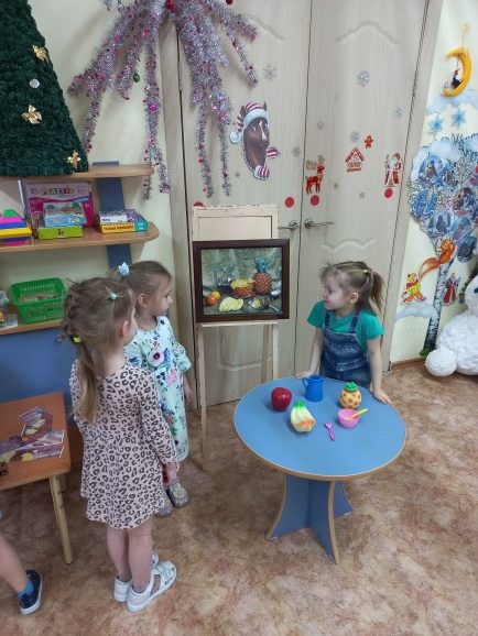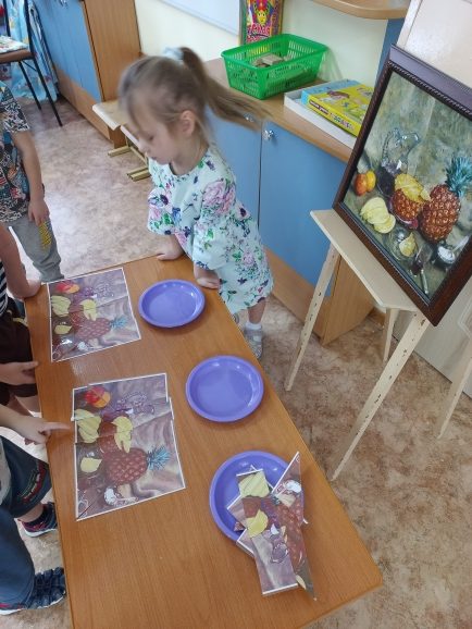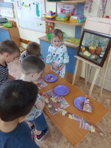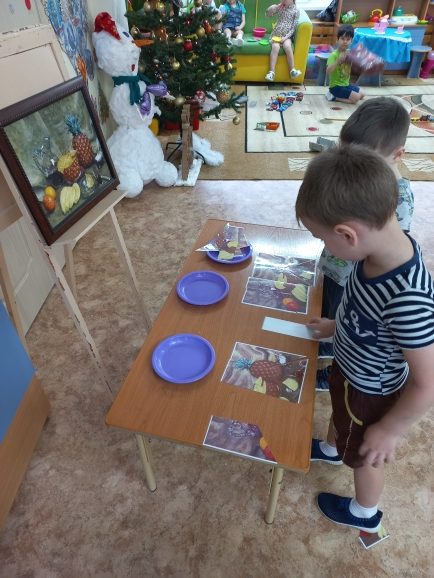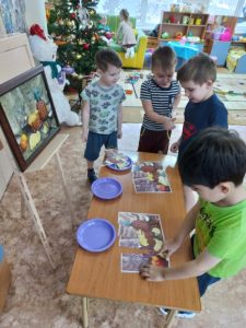 Дети знакомятся с новым жанром живописи- натюрморт, картина И.Машкова “Ананасы и бананы”. Что нарисовано на картине? Что вам нравится в картине? Предлагаю детям д/ игру ” Собери натюрморт” по картине ( формировать умение собирать из частей разной формы целое).
