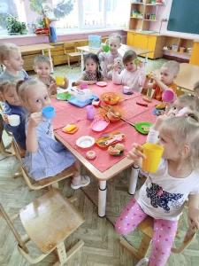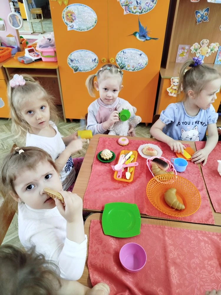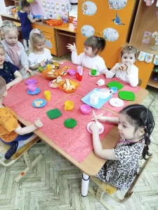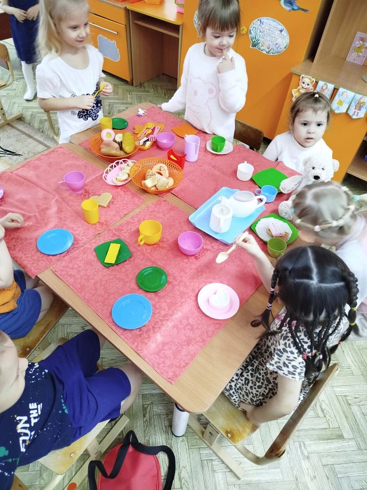 сервировка: ребята с удовольствием расставляли игрушечные чашки, блюдца и ложечки;