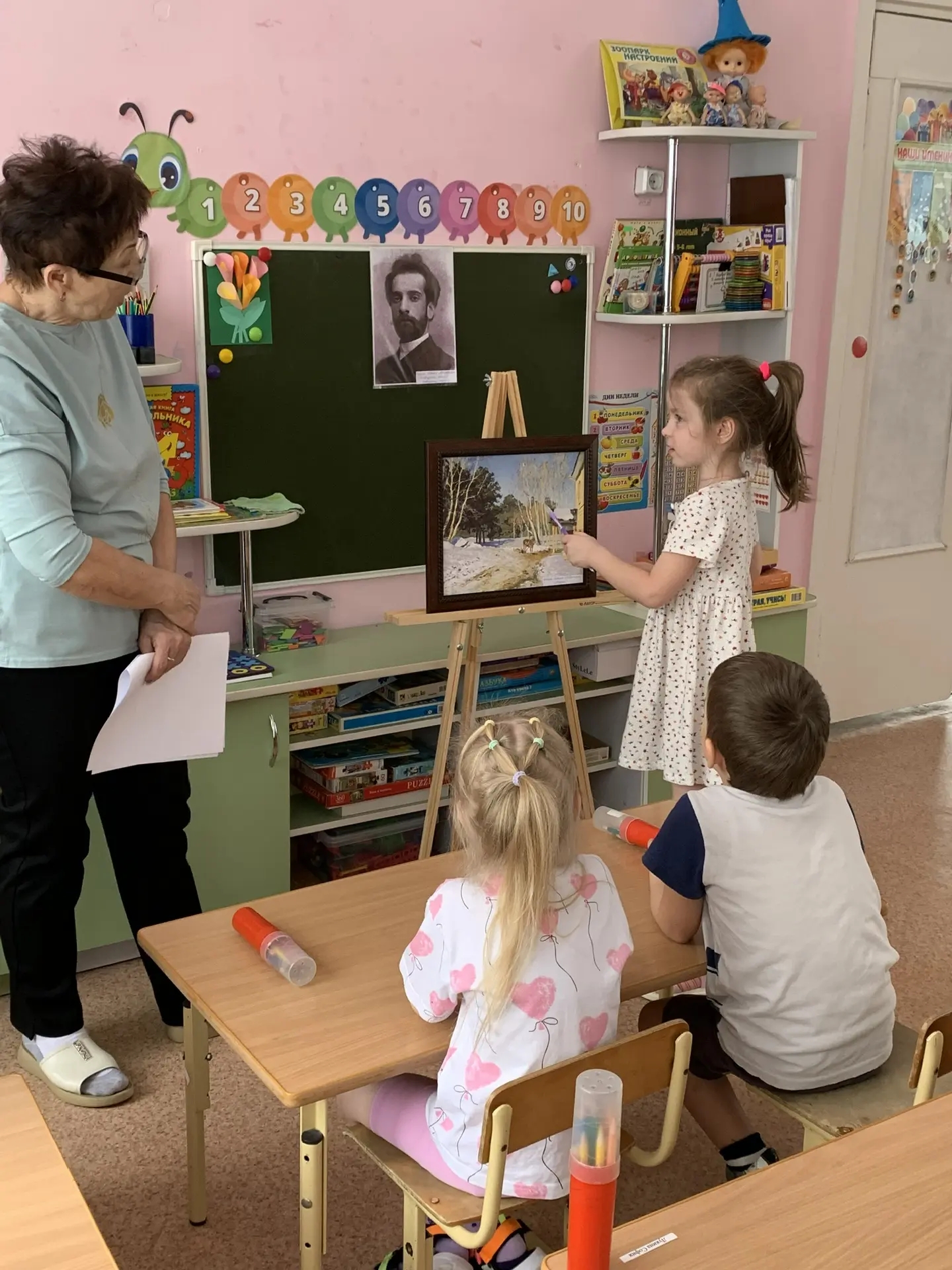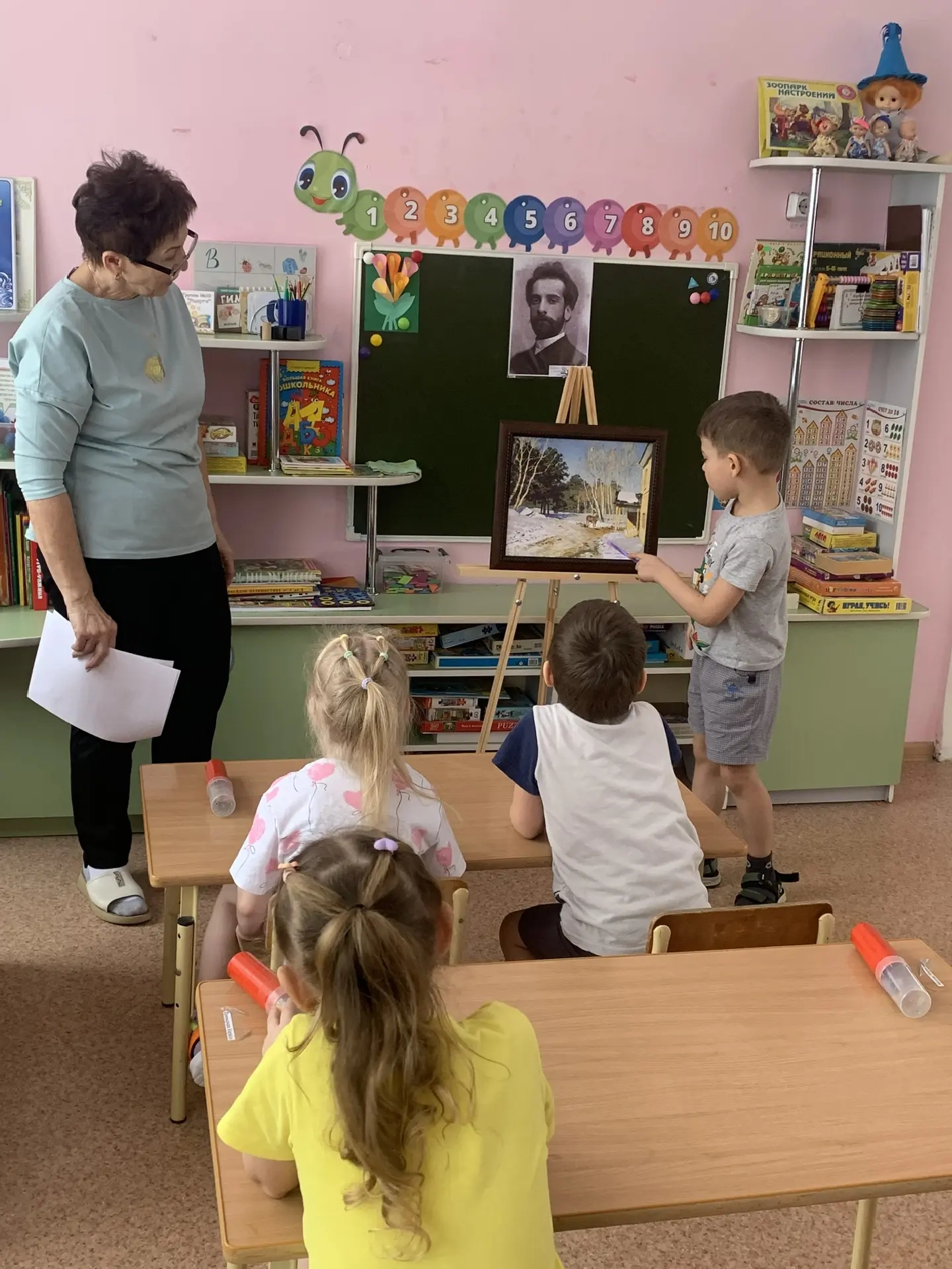 Вместе с ребятами мы внимательно изучили полотно Левитана и обсудили его детали. Дети отвечали на вопросы и составляли предложения — так мы тренировали связную речь и обогащали словарный запас.